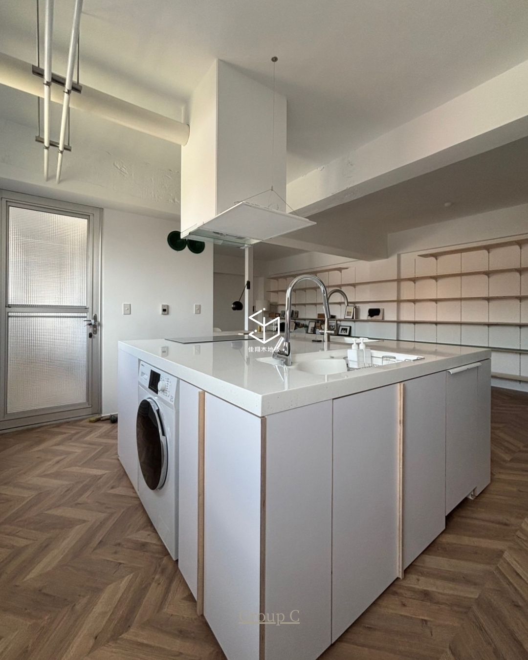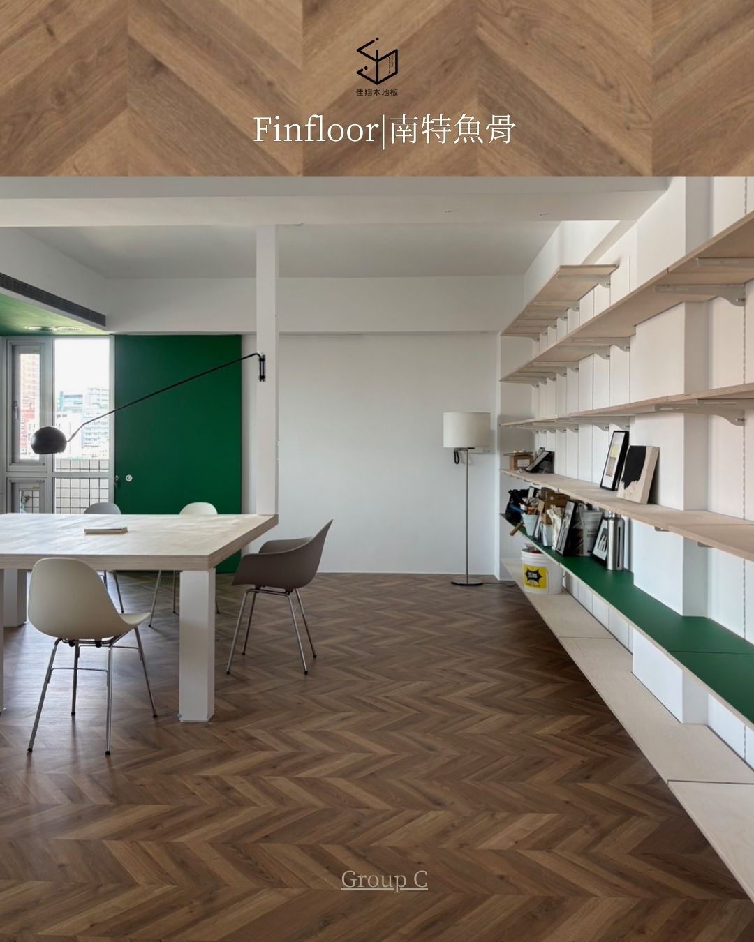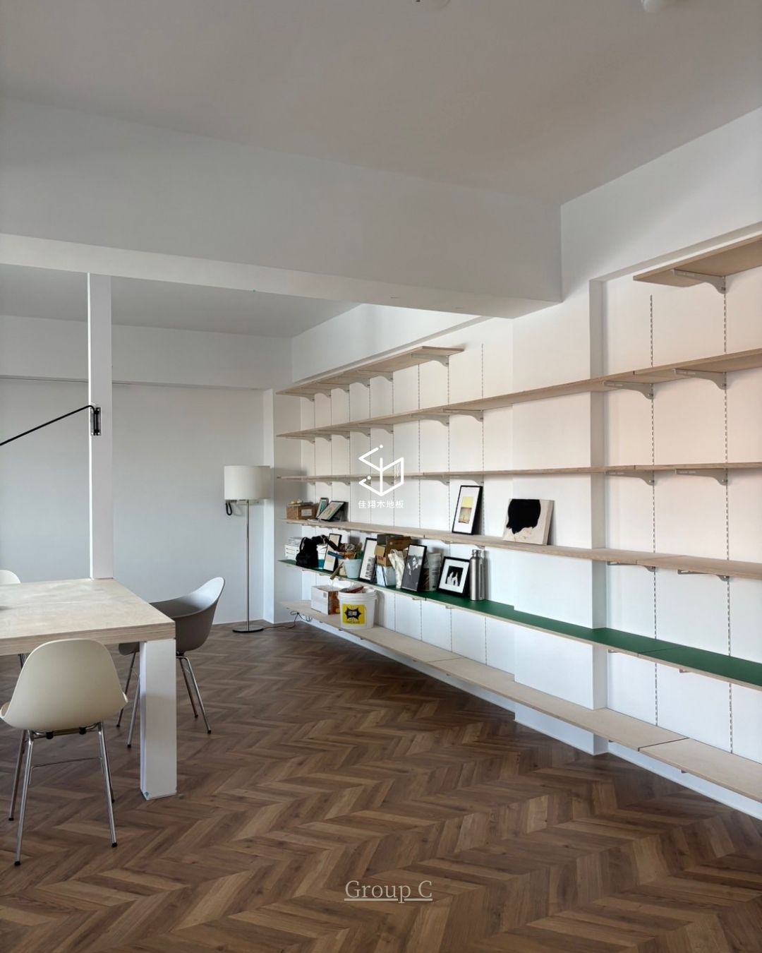 溫潤的木色與白牆、層板形成柔和對比,使空間在理性配置中保有溫度。魚骨的排列不刻意強調存在感,卻讓整體畫面多了一份穩定而耐看的秩序。