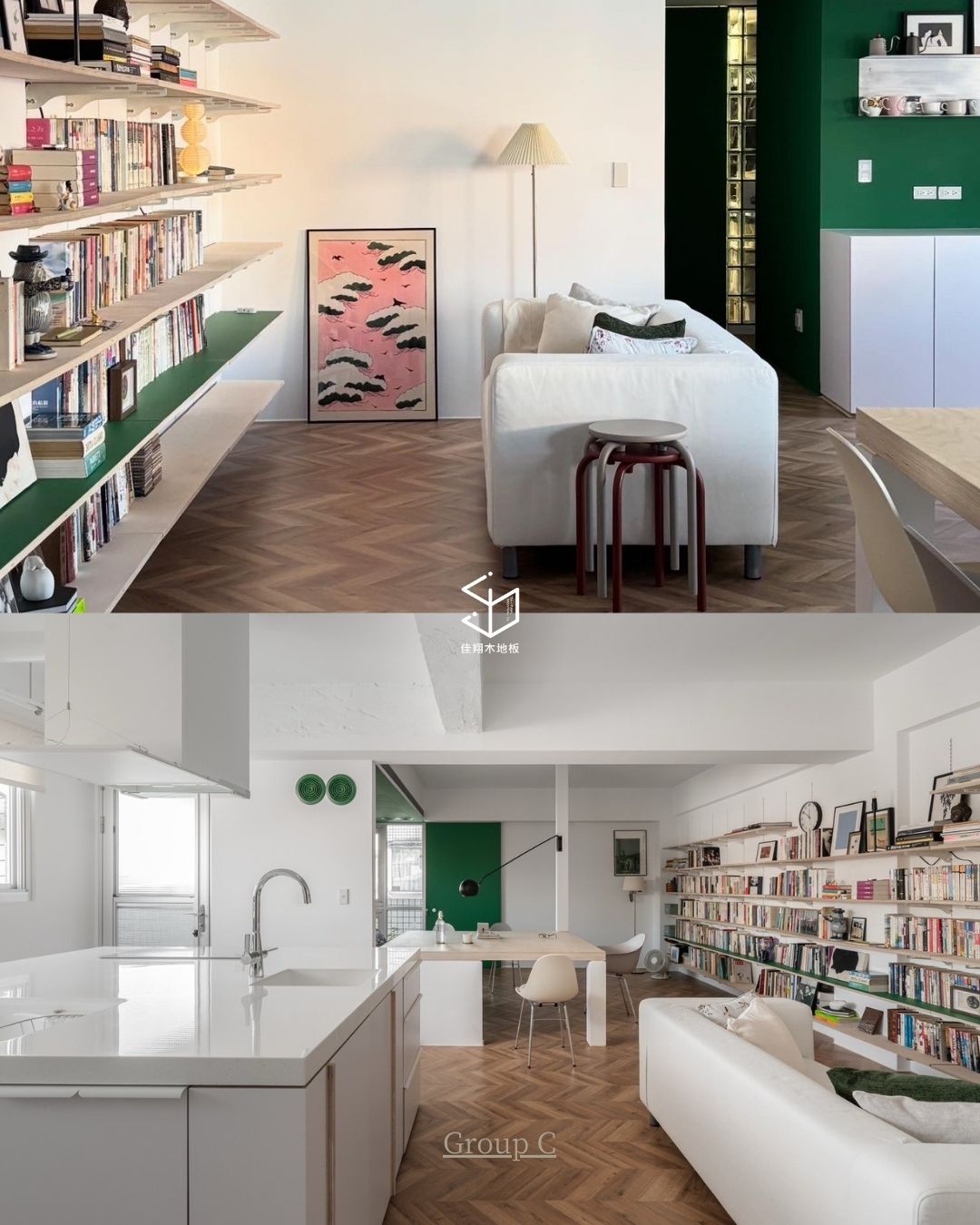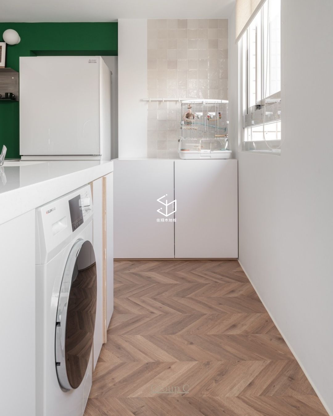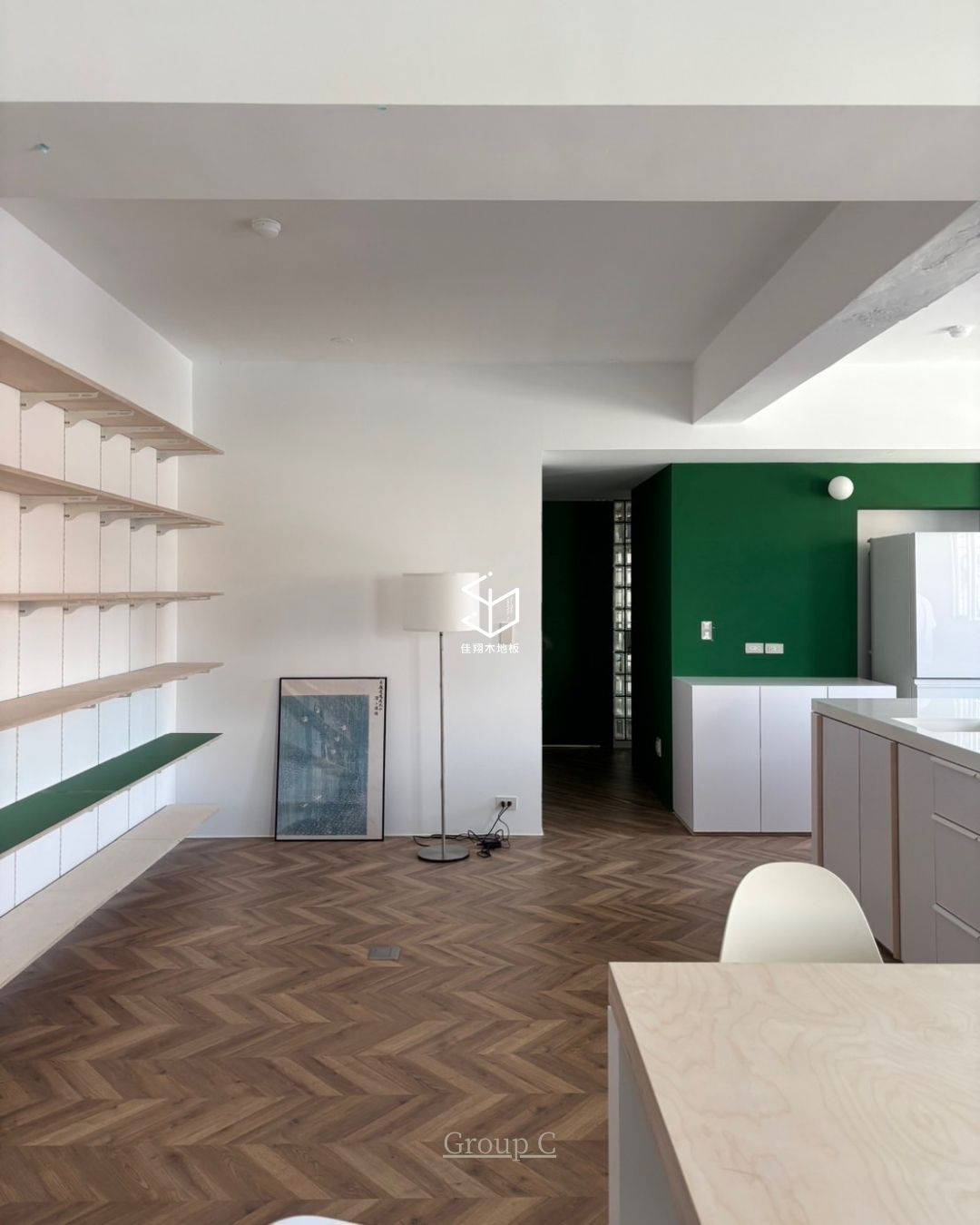 在留白比例較高的空間裡,魚骨拼地板自然成為視覺中最有節奏的部分。