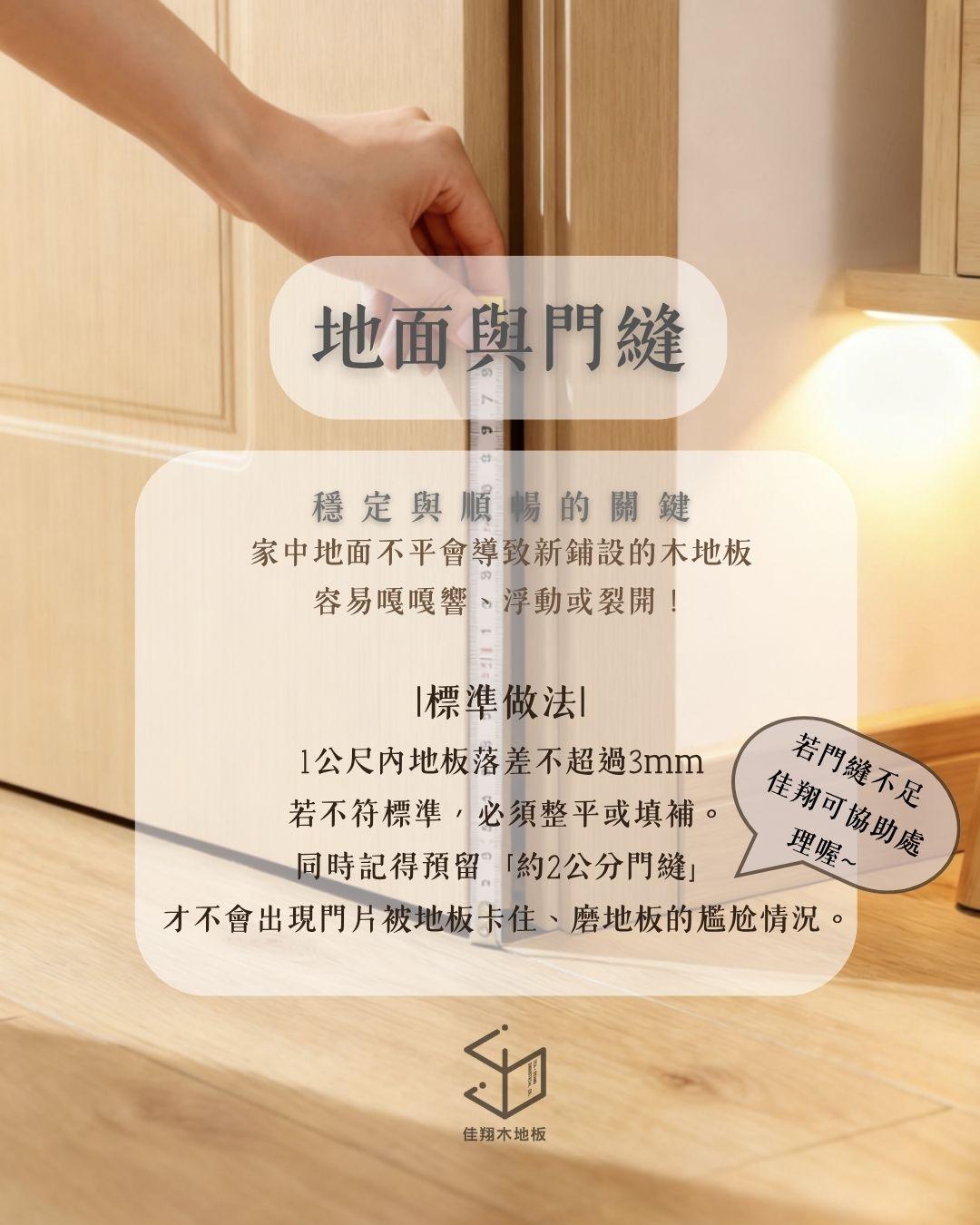 如果地面不平,後面很容易出現踩踏晃動、嘎嘎聲,或是木地板卡住門片。