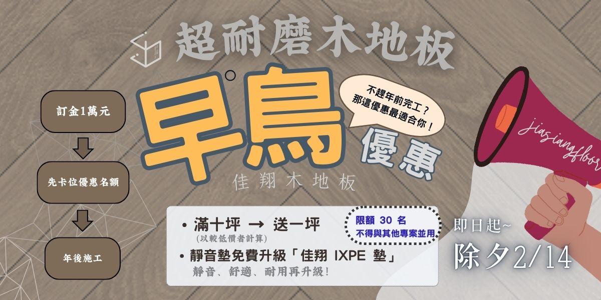 佳翔木地板推出的 《早鳥專案》限量 30 名,就是把普發 10,000 元變成「更高價值」的方式。只要在 即日起至 2026/2/14 前下單,即可提前卡位優惠價格,年後輕鬆施工,並享有多項專屬優惠。對正在找 台中木地板推薦、超耐磨木地板品牌、木地板施工預算 的屋主更是相當實用。