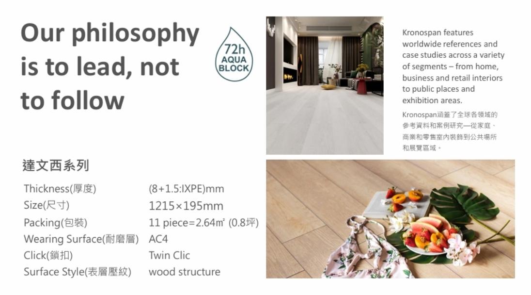 作為全球木製品領先者,長時效 防水、SGS認證長效抗菌功能、 甲醛含量符合歐盟E0等級、耐 磨程度達歐盟AC5、AC4等級, 讓顧客使用的安心、住的開心, 這才能讓我們放心